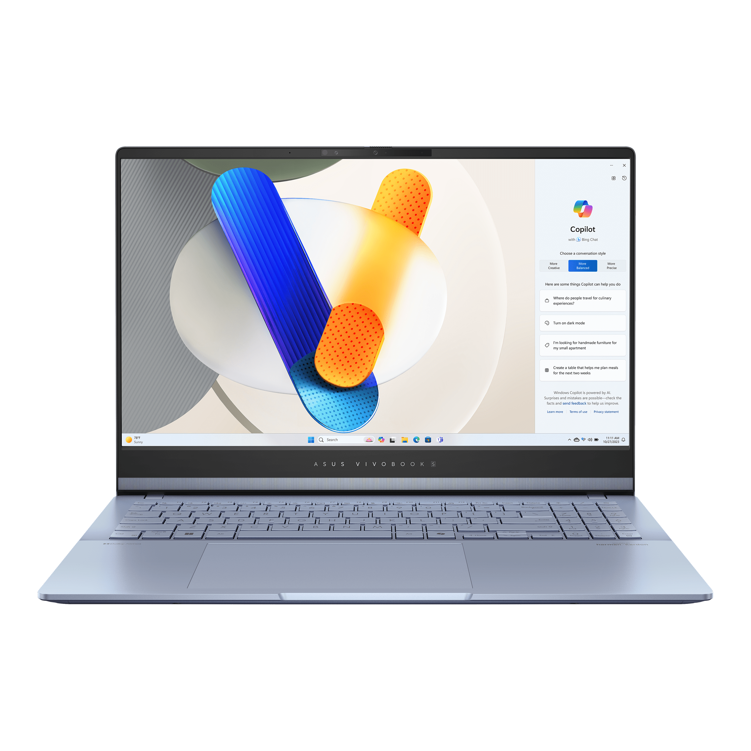 - Интеллектуальные функции: Ноутбук оснащен веб-камерой с технологиями ASUS AiSense, которые автоматически настраивают изображение во время видеозвонков. Двунаправленное шумоподавление с помощью ИИ обеспечивает кристально чистый звук.