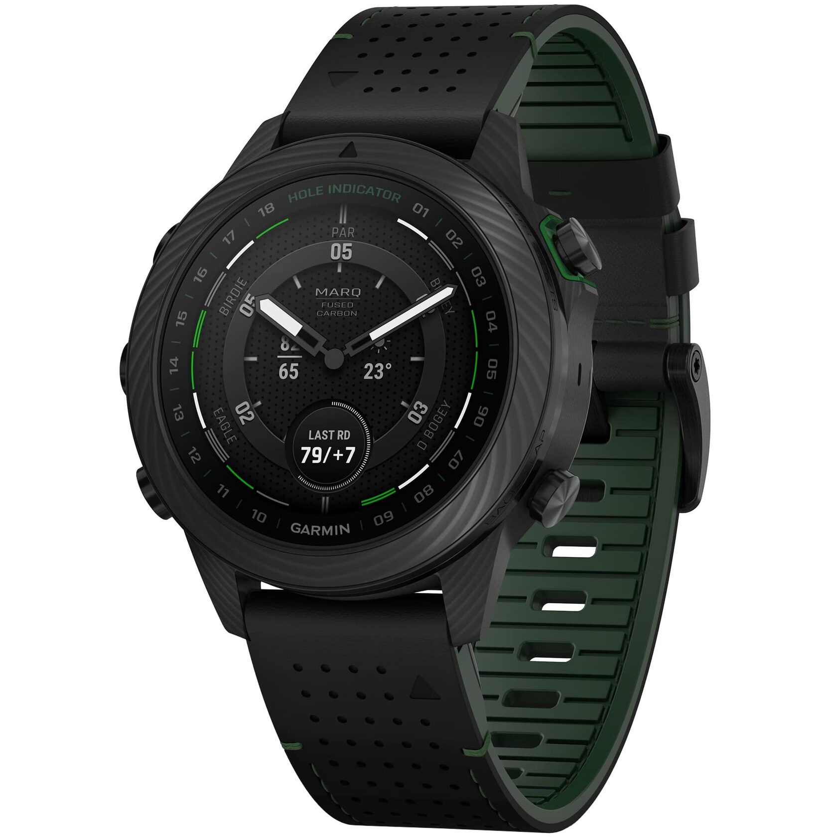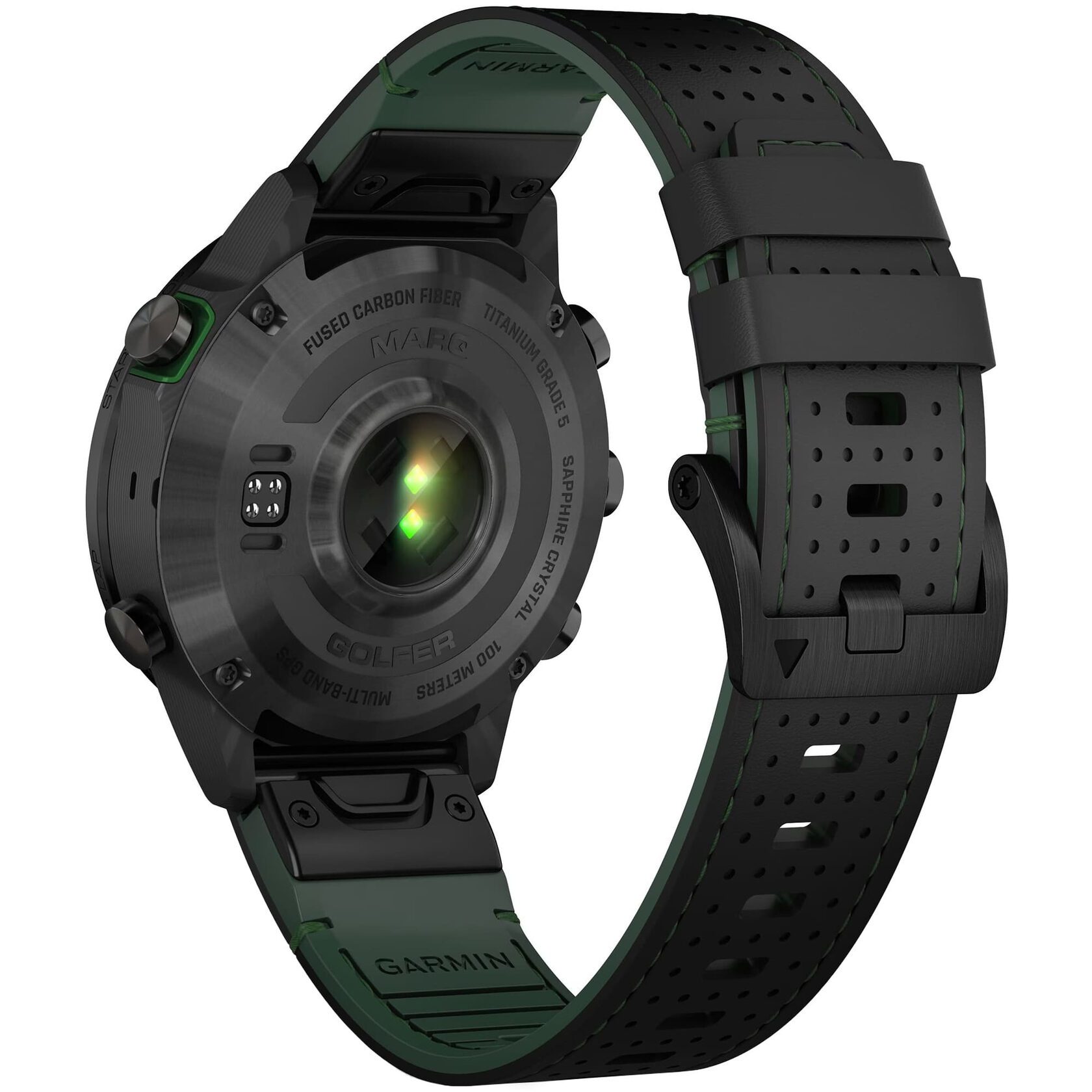 - Garmin MARQ Golfer (Gen 2) Carbon Edition с ремешком из черной / зеленой кожи и каучука FKM