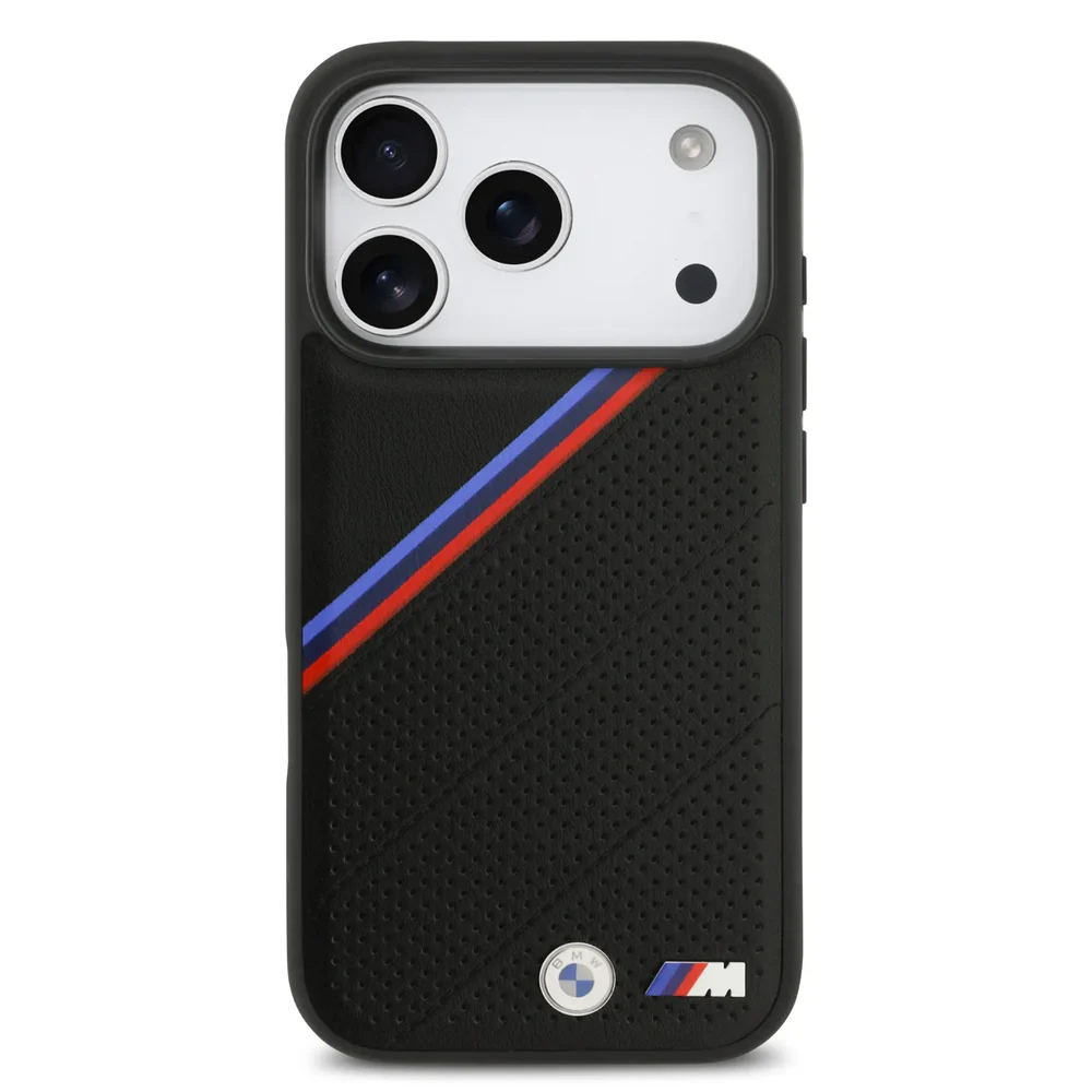 - Чехол iPhone 17 Pro Max BMW MagSafe Leather With Tricolor Slanted Stripes & Metal Logos
