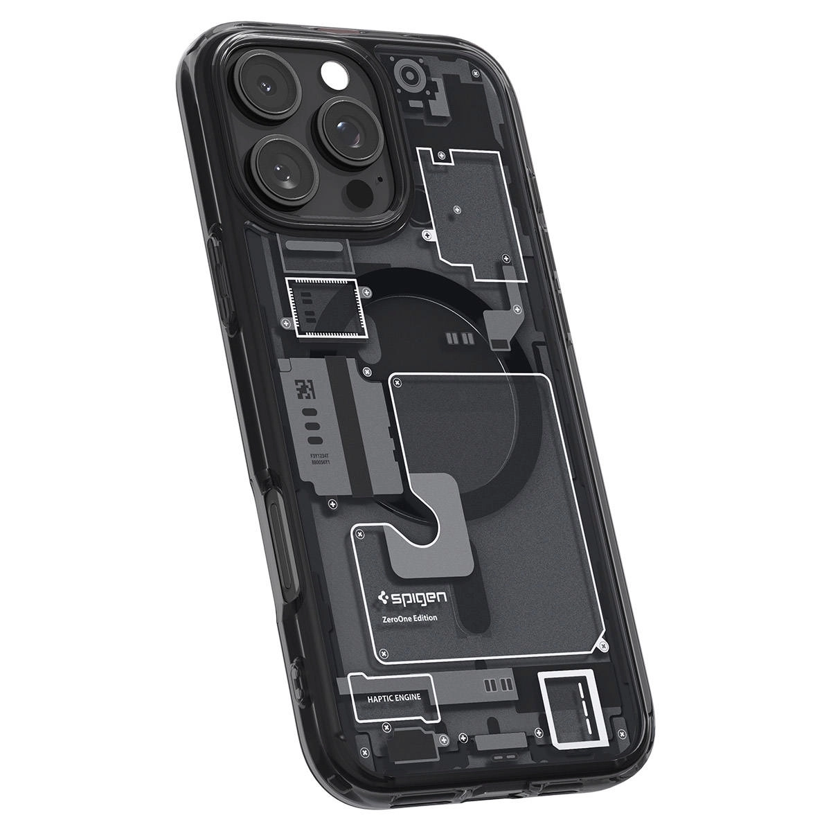 прозрачный кейс с уникальным дизайном, позволяющим видеть внутренние компоненты iPhone, с точными вырезами и совместимостью MagSafe для удобной зарядки и аксессуаров